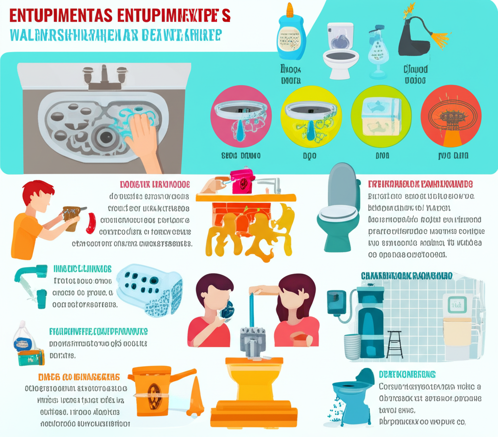 Infográfico com dicas práticas e ilustrações sobre como prevenir entupimentos em pias, ralos e vasos sanitários.