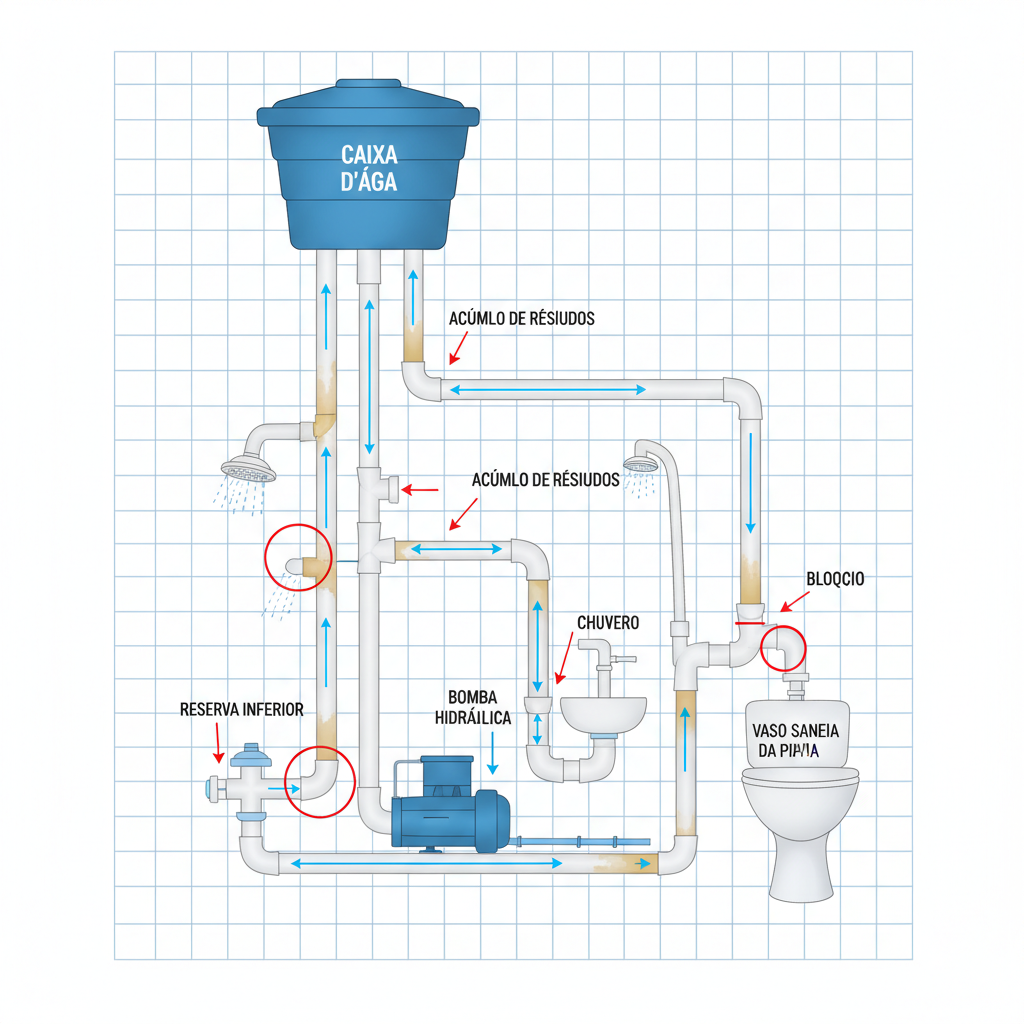 Entupimentos recorrentes em imóveis antigos: soluções definitivas A Persistência dos Entupimentos em Imóveis de Longa Data Representação esquemática de um sistema de tubulações residenciais antigas, mostrando a degradação e o acúmulo de sedimentos em curvas e junções. O desenho é