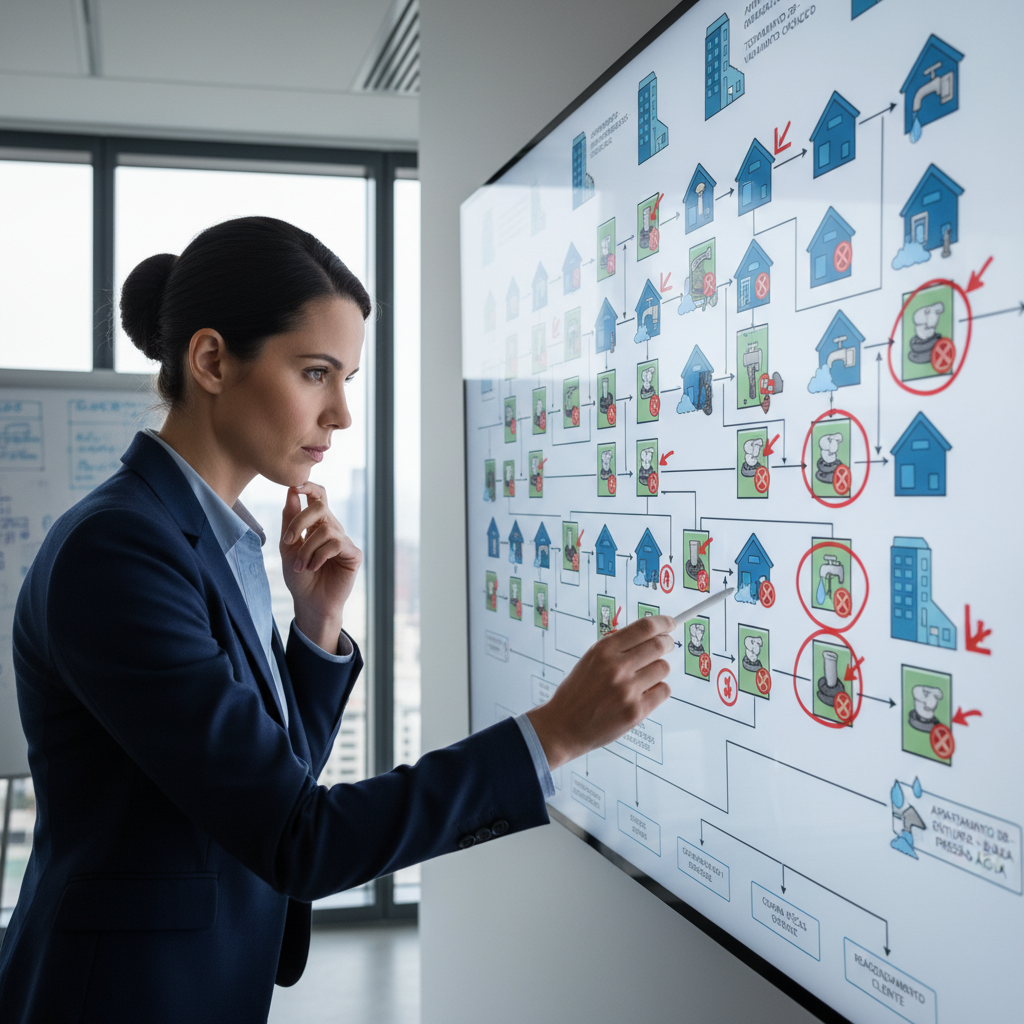 Como gestoras podem evitar entupimentos recorrentes nos imóveis O Desafio dos Entupimentos Recorrentes na Gestão de Imóveis Representação de uma gestora (Mariana) analisando um fluxograma de problemas hidráulicos em múltiplos imóveis, com ícones de entupimentos em diferentes pontos, transmitindo a